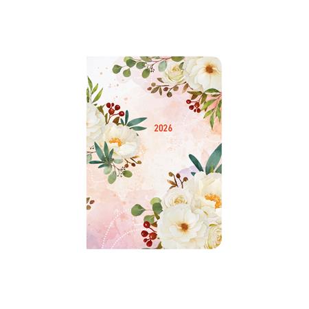 Színes grafikával díszített, matt fóliával bevont, fehér tömbös heti naptár, jelzőszalaggal.